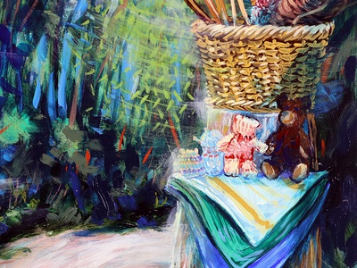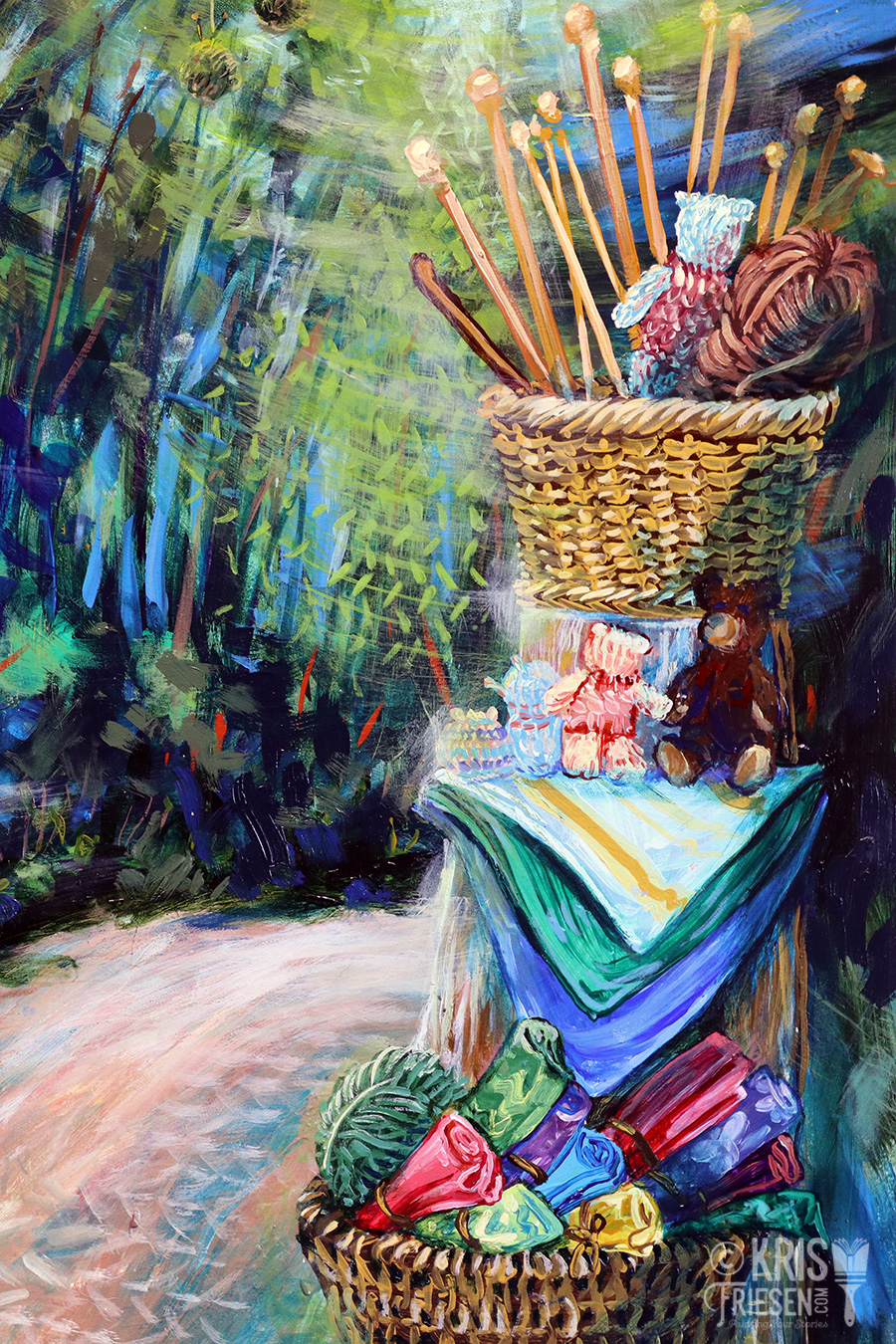 I painted a display stand of brightly coloured yarn and fabric in wicker baskets with knitting needles and had made teddy bears in this landscape artwork, set in a country road on Thetis Island. The painting was created as a special, idyllic setting where my client set up her yarn and fabric shop outside on a bright, sunny coastal day.