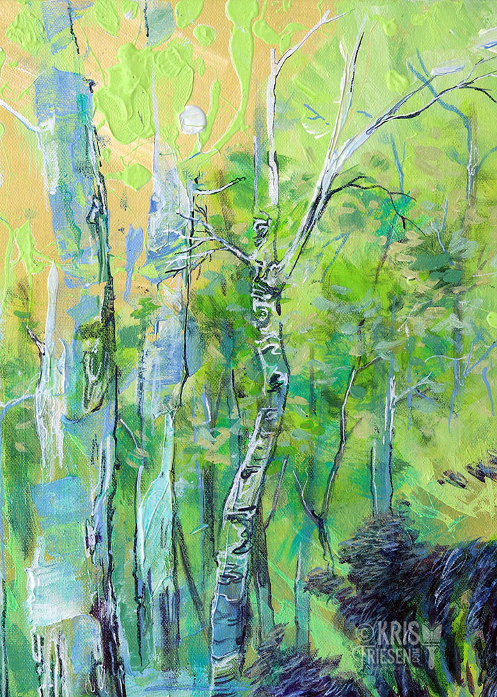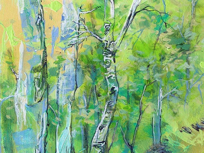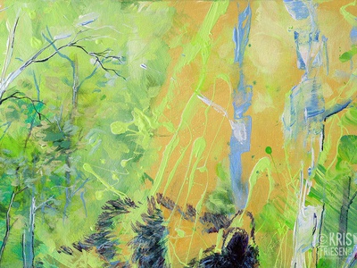 “Maternal Glow” 20 by 24 inches, acrylic on canvas. I wanted to paint a tender moment between a black bear mother and cub. A light green abstract action painting illuminates the scene with a poplar forest background of warm light.