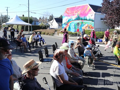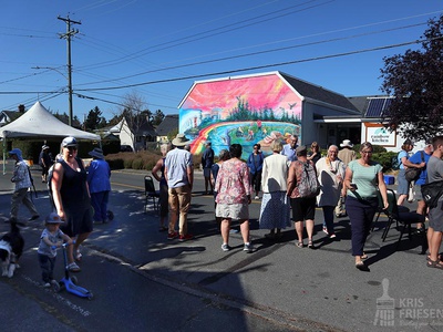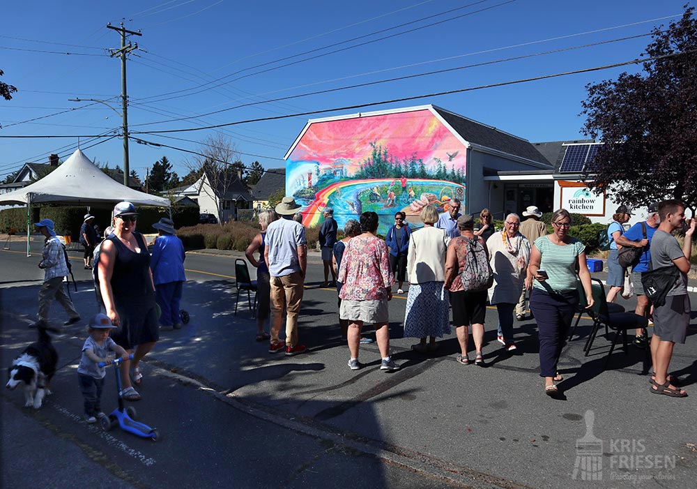 A mother gestures towards the unveiled colourful mural “Esquimalt Rainbow” nearby public party goers at the all ages hootenanny mural celebration. When the public interacts with and shows love for my murals my heart always melts.