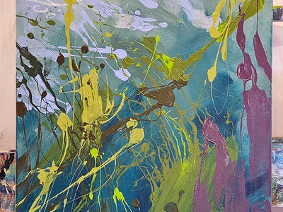 A handsome sea otter face emerges out of the green pools and drops of thrown acrylic paint to give the viewer a quick look before swimming to the surface of this seascape painting. We can see the long whiskers that sea otters use to help find hidden prey in crevices and the sea floor.