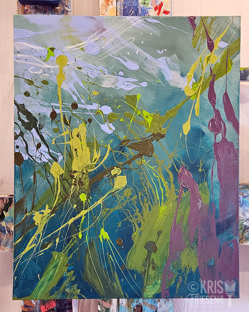 Fluid yet thick acrylic paint in shades of olive and teal green was thrown onto canvas in this original abstract wall art that ended up suggesting an underwater kelp forest. I love creating this type of art, gestural abstraction, in which the spontaneous expression of physical movement with a brush becomes the author in paint.