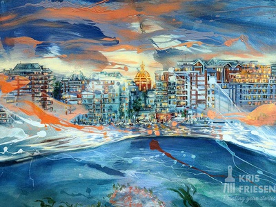 Below the bright urban waterfront of Victoria an ocean wilderness finds its way, unseen but right beside us below the surface. I painted this seascape to be mixed with expressive abstract strokes that bring viewers to meet an octopus tour guide and other wildlife.