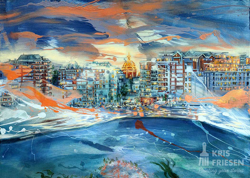 “Victoria Undersea Dream” is a 48 by 36 original seascape large enough to let the upper cityscape section breath it’s details into life. It was an exciting to bring a different view of the Victoria, BC waterfront into a painting revealing abundant sea life just below the surface in an over under split shot artwork.