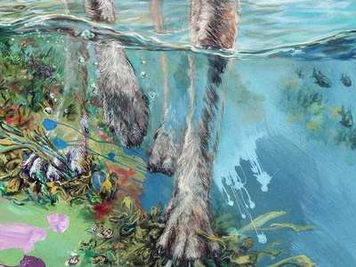 “Takaya and the Sea” is a 71 by 47 inch original acrylic painting on canvas of Takaya, the Discovery Island sea wolf. This abstract wildlife artwork is a larger-than-life portrait of the sea wolf Takaya gracefully capturing our eyes as he momentarily looks into the viewer. The far background shows the shore lines of Oak Bay and Victoria, BC.